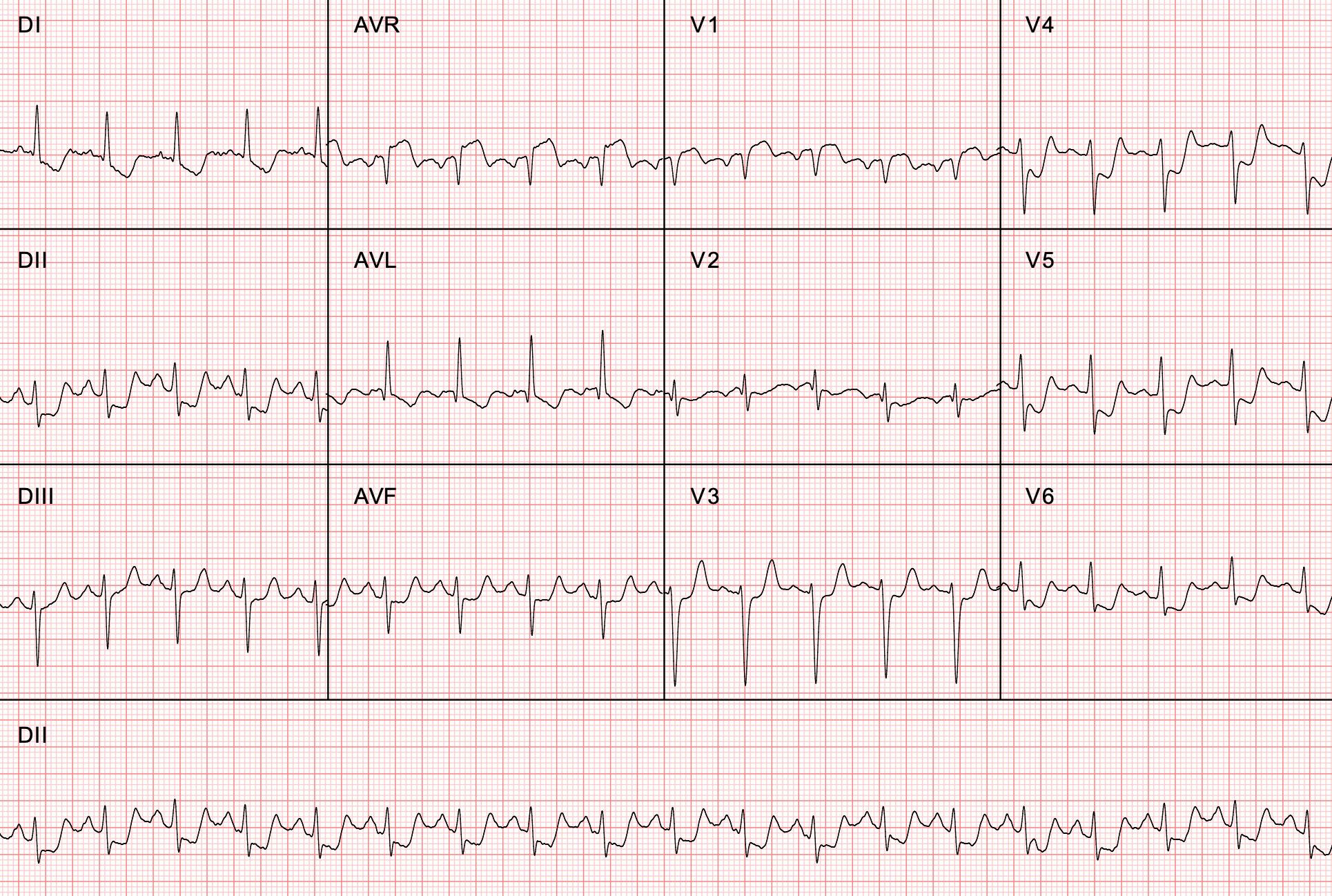 Paciente do sexo feminino, 57 anos, com quadro de dor torácica. É portadora de hipertensão arterial sistêmica e diabetes mellitus em uso de losartana e metformina. O eletrocardiograma evidencia taquicardia sinusal (FC 114 bpm) com supradesnivelamento do segmento ST de 2 mm na derivação avR, com infradesnivelamento do segmento ST de até 5 mm em D1, D2, avF, V3 a V6, o que caracteriza a isquemia circunferencial.
